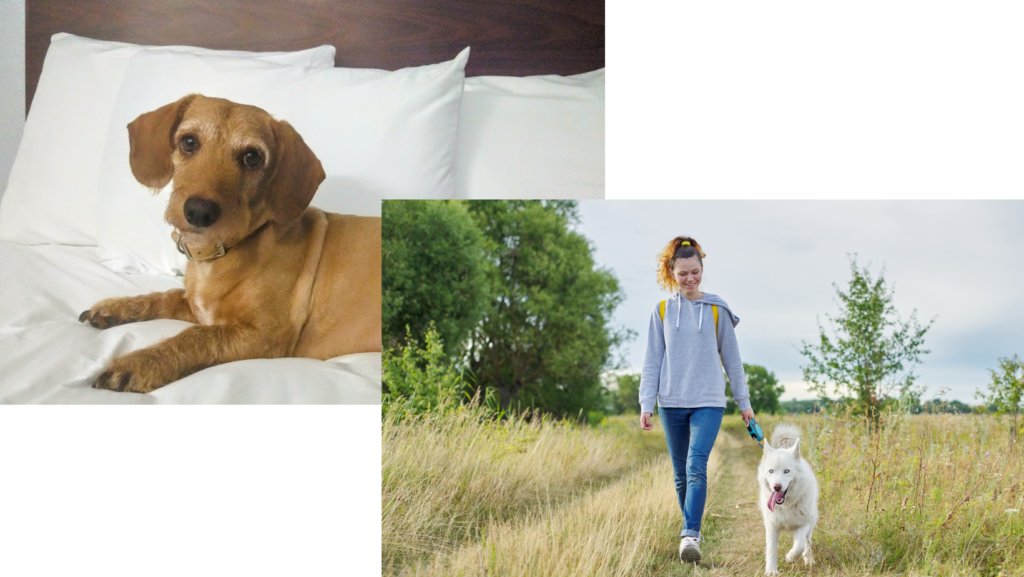- Codzienne spacery poza teren działki, do pobliskiego lasu, dostosowane do temperamentu i możliwości psa. Spacery odbywają się indywidualnie lub w towarzystwie innych psów, w zależności od preferencji pupila.